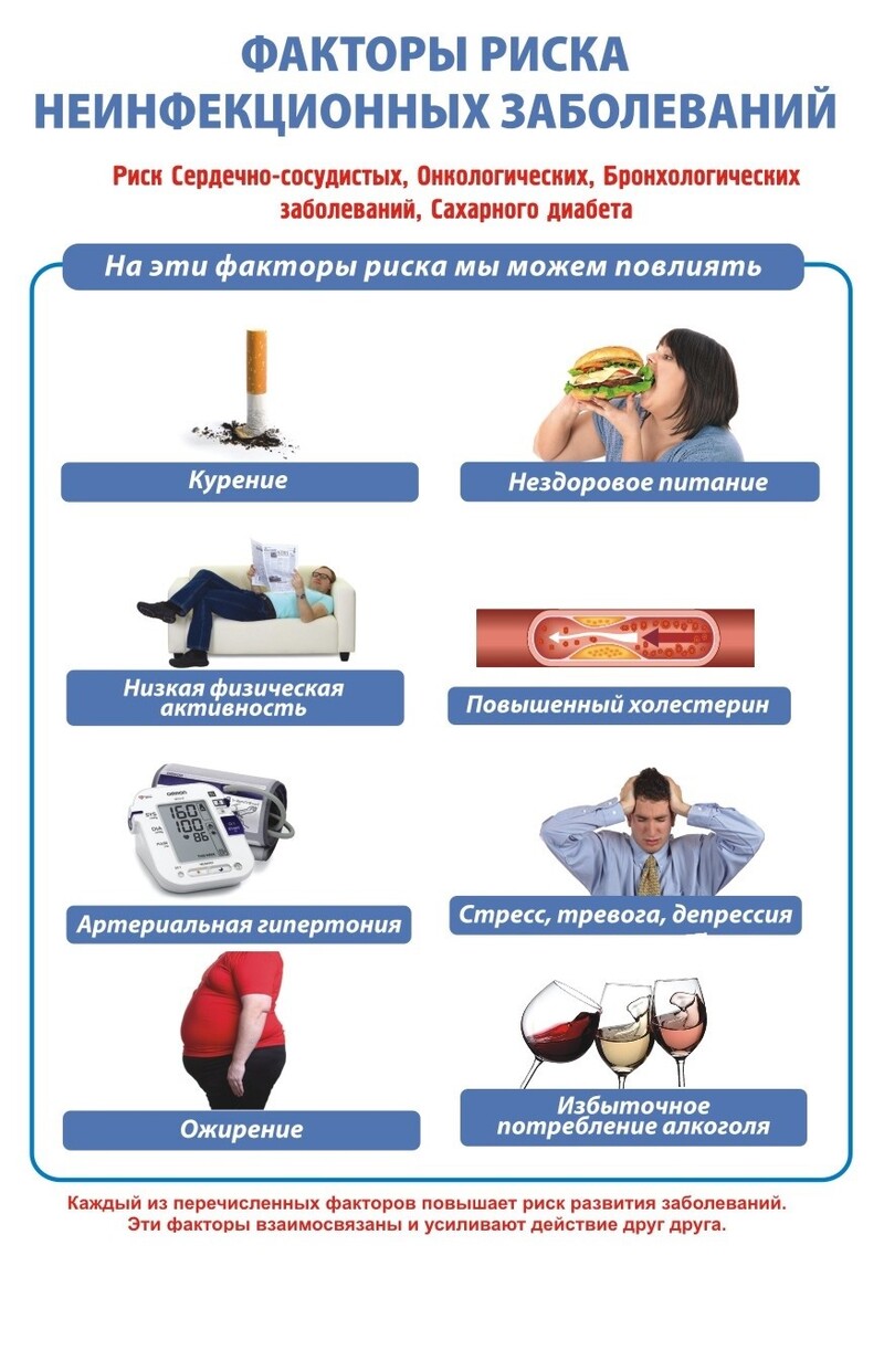 Неинфекционные заболевания (НИЗ) — хронические болезни, которые не передаются от человека к человеку, а развиваются из-за различных генетических, физиологических, экологических и поведенческих факторов (курение, плохое питание, стресс, гиподинамия).