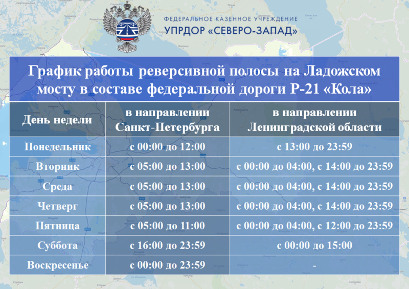 ФКУ Упрдор «Северо-Запад» сообщает, что в целях обеспечения максимально возможного уровня пропускной способности начиная с 28 марта на Ладожском мосту будет введена дополнительная, третья полоса движения, по которой будет организовано движение автомобильного транспорта в реверсивном режиме: в утренние часы – для въезда в город, в вечерние – для выезда. Данная мера необходима для уменьшения автомобильных заторов в часы максимальной интенсивности дорожного движения.